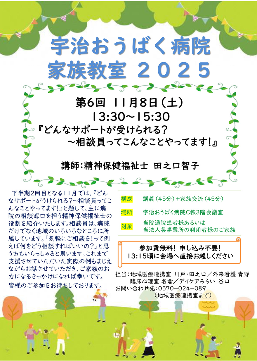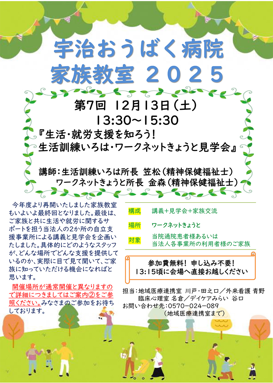 2025年1月3日より宇治おうばく病院認知症治療病棟にてインフルエンザ感染症が発生、その後同病棟内で感染者が増加してきています。風邪症状のある方、発熱の方は即日検査し、必要に応じ治療薬の投与を開始しています。また、安全を確認しながら診療は平常通りに継続しています。