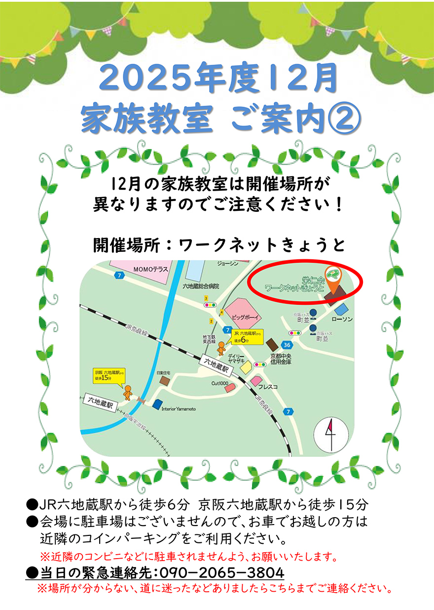 12月は、生活訓練いろは・就労移行支援事業所ワークネットきょうとの見学会を企画しており、開催場所がいつもと異なりますのでご案内をご参照ください。